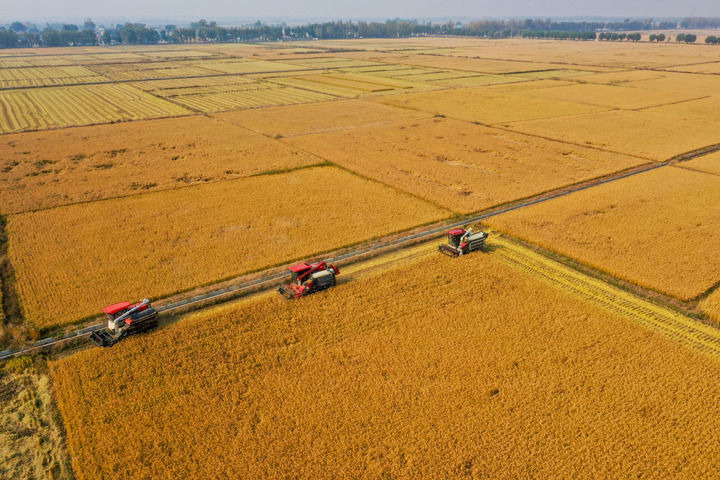 10月14日,在吉林省公主岭市,吉林省米兜种植农民专业合作社进行机械化收割水稻作业展示(无人机照片)。