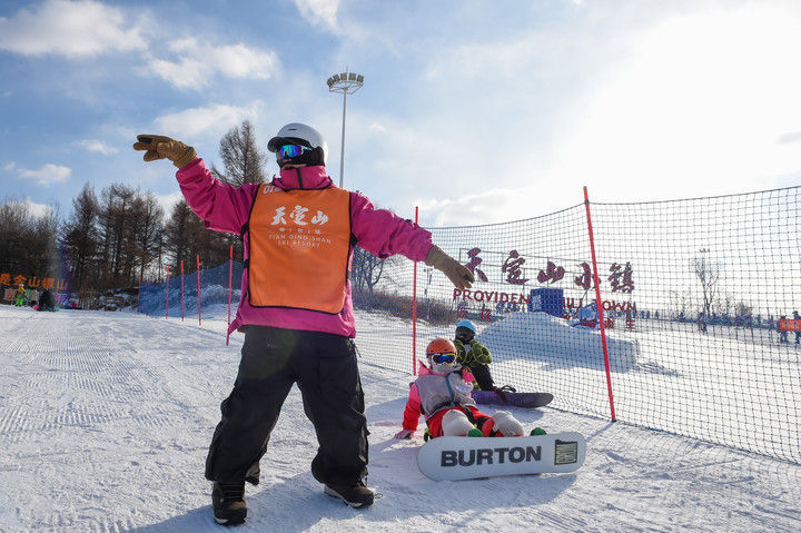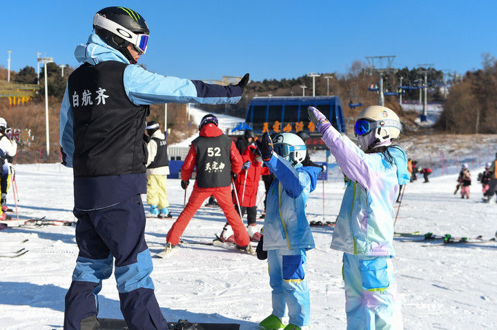 12月3日,在长春市天定山滑雪场,教练教学生和家长滑雪。