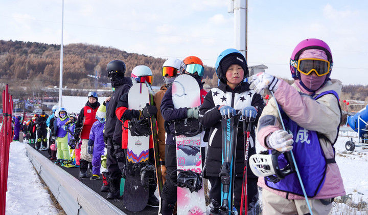 12月3日,小学生在吉林市纳美山谷度假区乘坐魔毯准备滑雪。