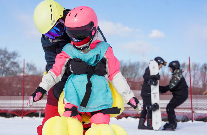 12月3日,吉林市一小学生在吉林市纳美山谷度假区学习单板滑雪。
