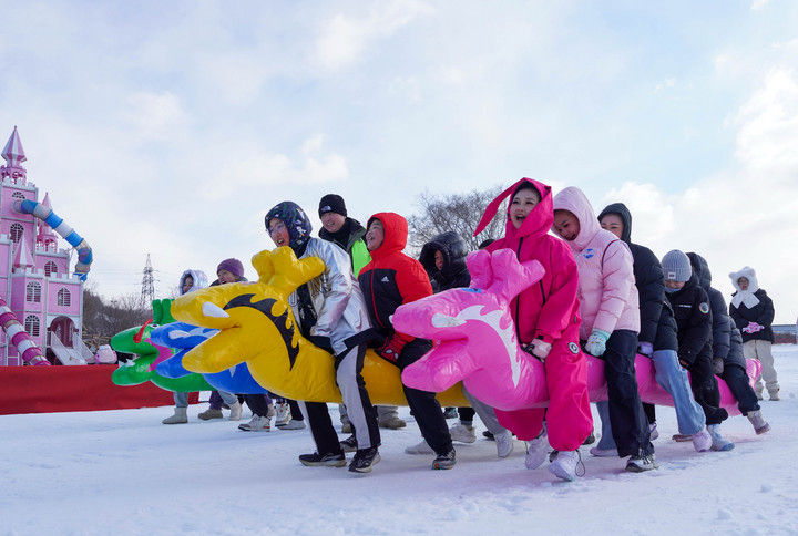 12月3日,吉林市中小学生在吉林市纳美山谷度假区体验雪地龙舟比赛活动。