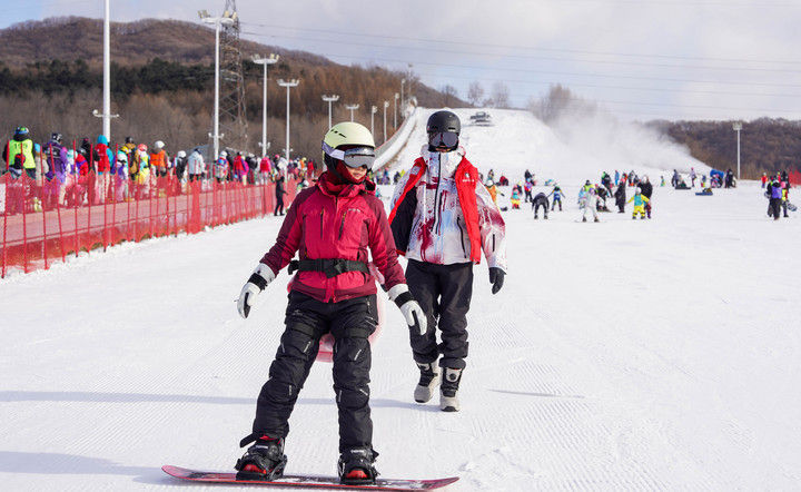 12月3日,吉林市中小学生在吉林市纳美山谷度假区体验单板滑雪。
