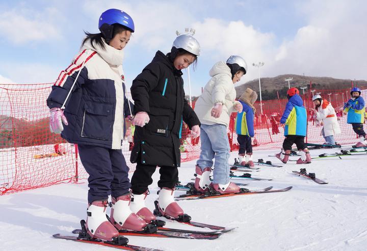 12月3日,吉林市中小学生在吉林市纳美山谷度假区学习滑雪。