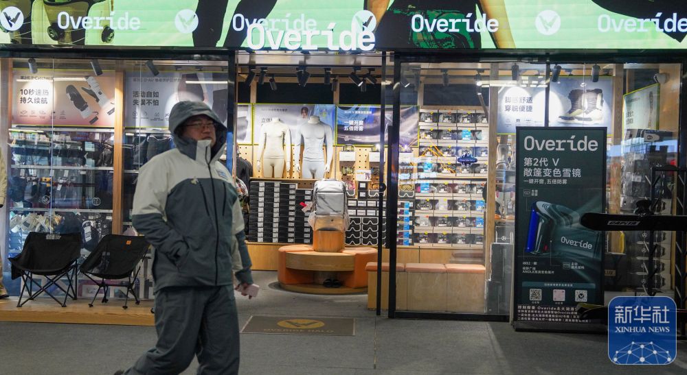 ↑ 在吉林市北大湖滑雪度假区,游客经过一家国产品牌雪具店。