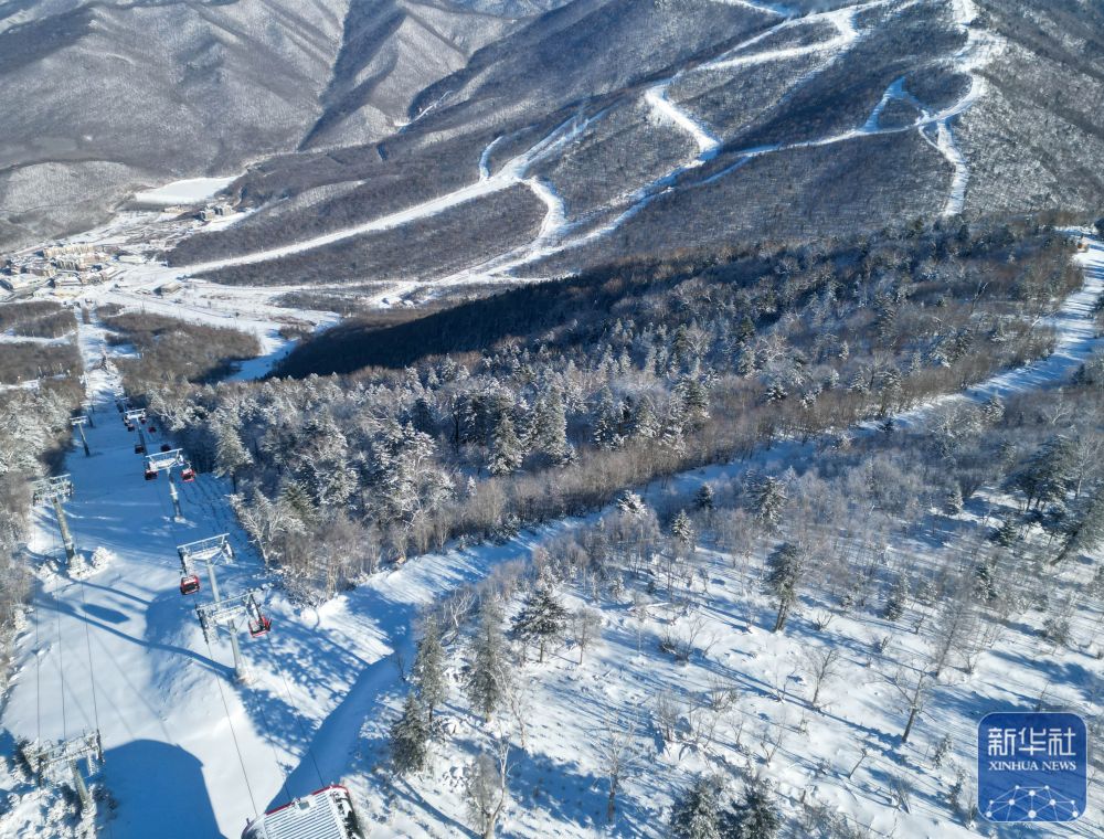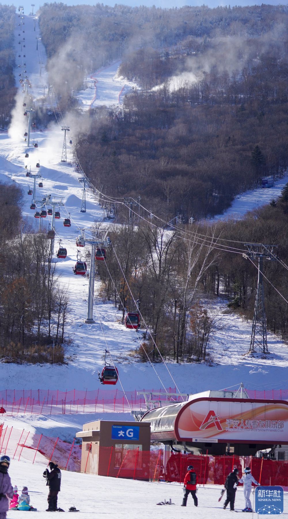 ↑ 在吉林市北大湖滑雪度假区,滑雪爱好者乘坐国产缆车达到山顶(无人机照片)。
